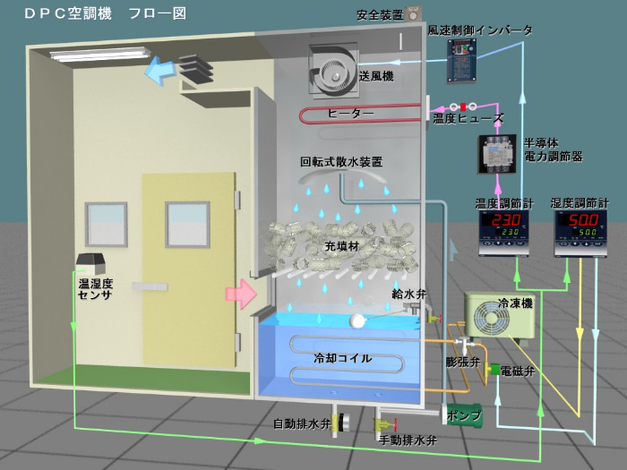 DPC方式は、夏季は、空気中の水分を精密に除湿するだけで、高い精度の湿度を得ています。